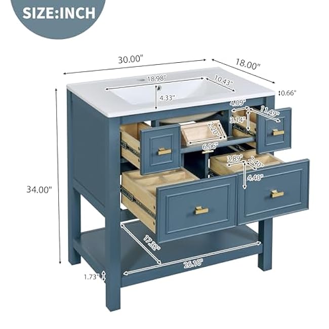 Maximize Bathroom Space with 30” Free Standing Vanity Set, 5 Drawers, Ceramic Sink, Blue Finish