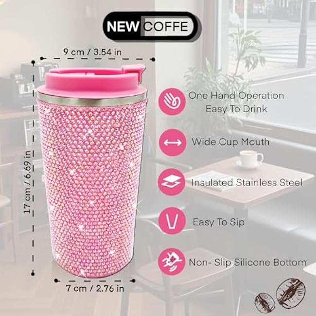 17oz Rhinestone Insulated Coffee Mug with Leak Proof Lid | Stainless Steel Vacuum | Bling Travel Coffee Mug | Studded Diamond Sparkly | Reusable Portable To Go Tumbler | Pink