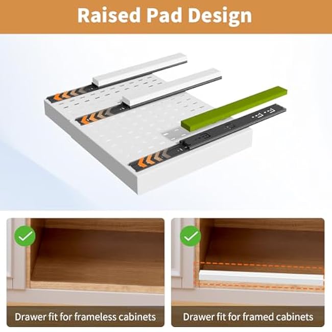 1Pack Expandable Pull Out Cabinet Organizer 16.5 D with Raising Pad for Framed Cabinets, Slide Out Drawers with 4pcs Divider Racks, Pull Out Shelves Adhesive, Adjustable Width 12.2-20.7