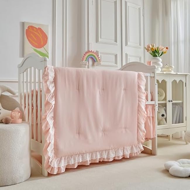 - [ Design ] Tufted Shabby Chic boho Style with lace ruffle, Simple and Pure Color design brings you the visual enjoyment of beauty. The comforter have 2 inches ruffle and 1inch lace make it very cute and luxury for boys or girls. The main style is solid color style. American country style crib bedding set. Try some simple color and offer you baby a nice sleep. Boho tufted style is super great for the coming spring