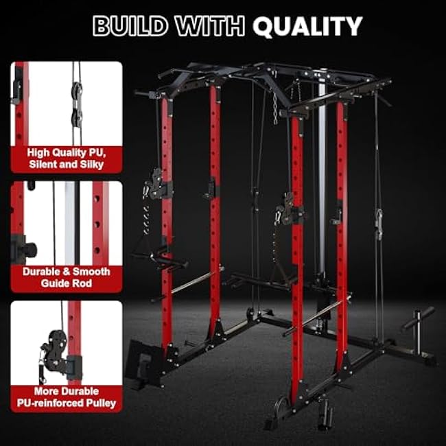 Multi-Function Power Cage – 1500LBS Squat Rack with LAT Pulldown Cable Pulley System, Home Gym Strength Training Machine with Attachments