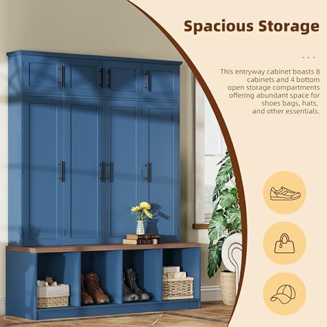 Fashion ON – Trend Farmhouse Hall Tree – 4 Hidden Hooks, Walnut Seating Bench, 8 – Door Entryway Shoe Cabinet High Quaity