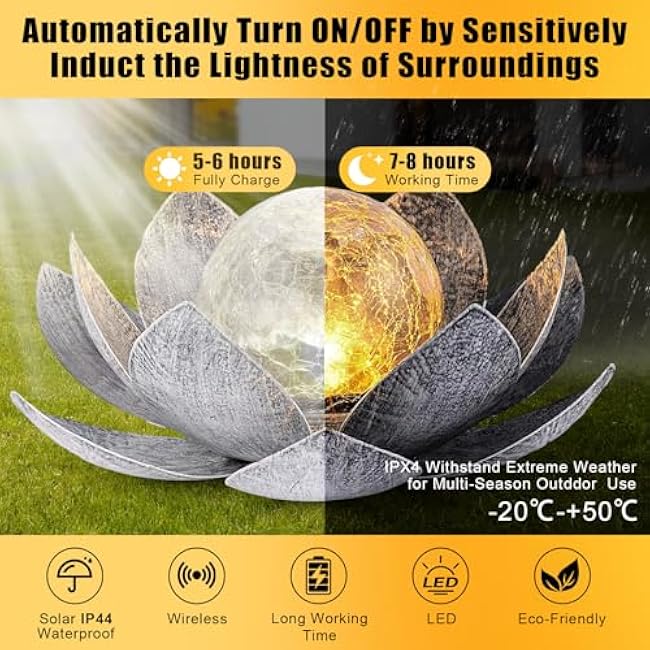 Be the first to review “VIHOSE 4 Pcs Lotus Solar Light Outdoor LED Waterproof Art Globe Glass Decoration Outdoor Table Decor Garden Gifts Decorative Crackle Globe Glass Metal Lotus Flower for Patio Lawn(Silver)” Cancel reply