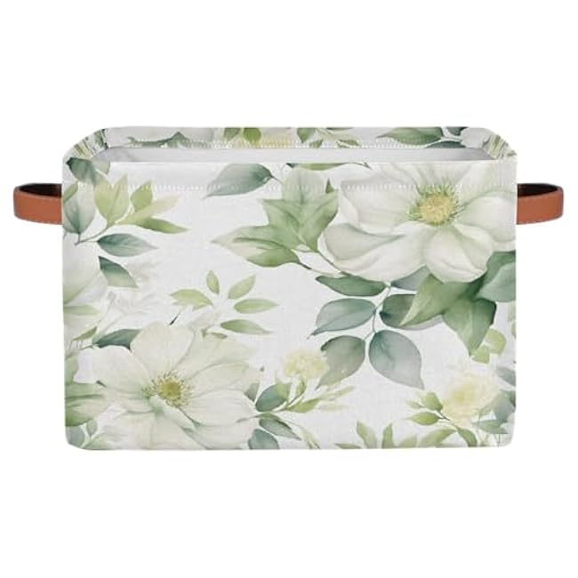 White Flower Large Fabric Storage Bins with Handles, Decorative Organizing Baskets for Shelves, Collapsible Cube Storage Organizer for Clothes, Toys & Essentials